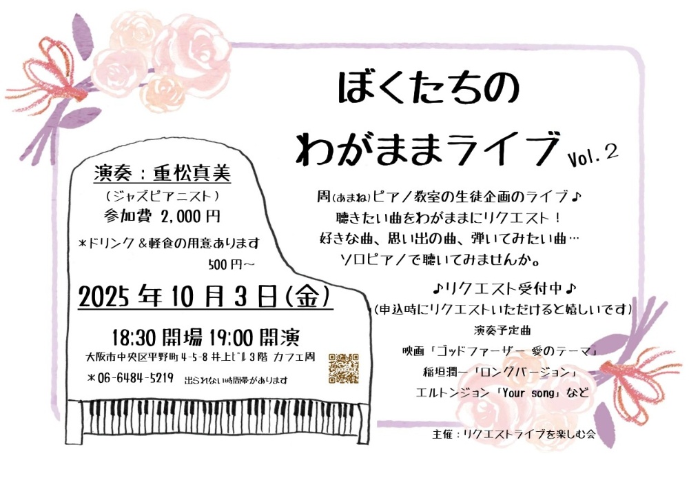 2回同じ内容で行います。お申し込みの際に時間帯もご連絡ください
