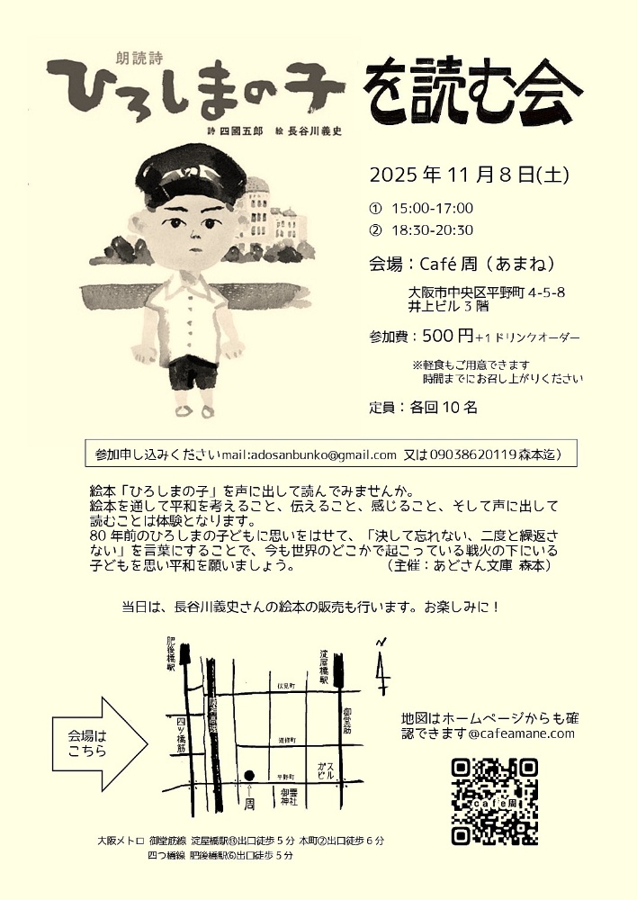 当日は『ひろしまの子』を中心に平和関連の絵本を順番に、ご参加の方々と読み進めます。人前で読むことが初めての方も、もちろんご経験者の方も改めて声に出して、読んでみませんか。